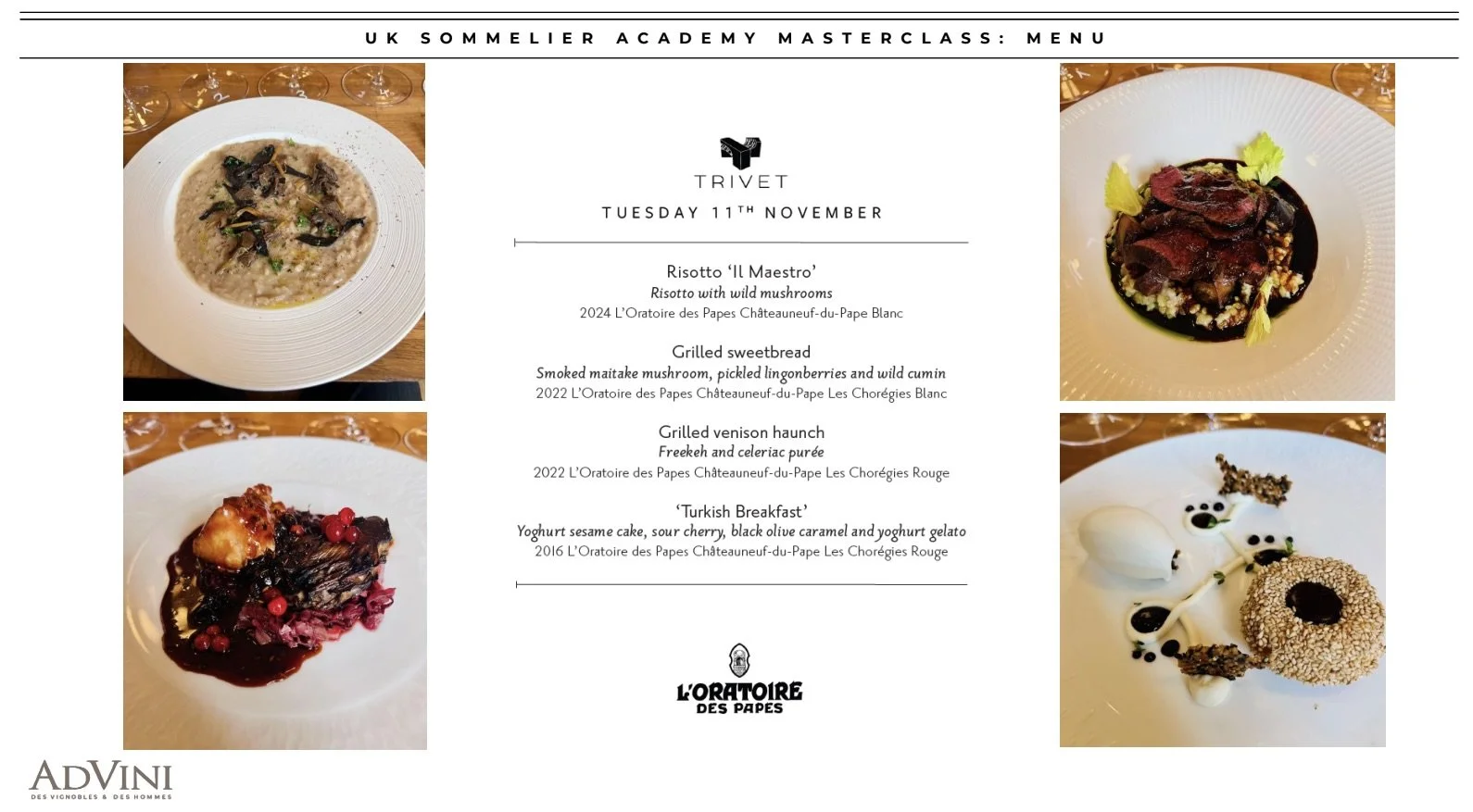 Last Tuesday, UKSA members were treated to an exceptional and educational journey into the heart of the Southern Rhône, thanks to the generosity of AdVini wines. The day featured a magnificent L’Oratoire des Papes Masterclass followed by an exquisite two-Michelin-starred wine-paired lunch at London’s acclaimed Trivet Restaurant.